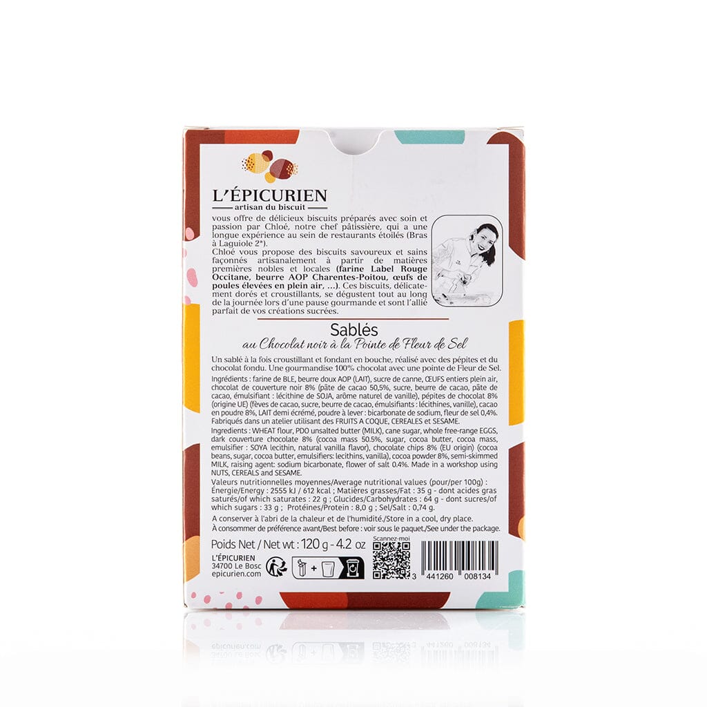 Un sablé à la fois croustillant et fondant en bouche, réalisé avec des pépites et du chocolat fondu. Une gourmandise 100% chocolat avec une pointe de Fleur de Sel.